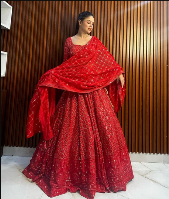 Red Faux Georgette Thread with Sequins 3pc Kurta Set