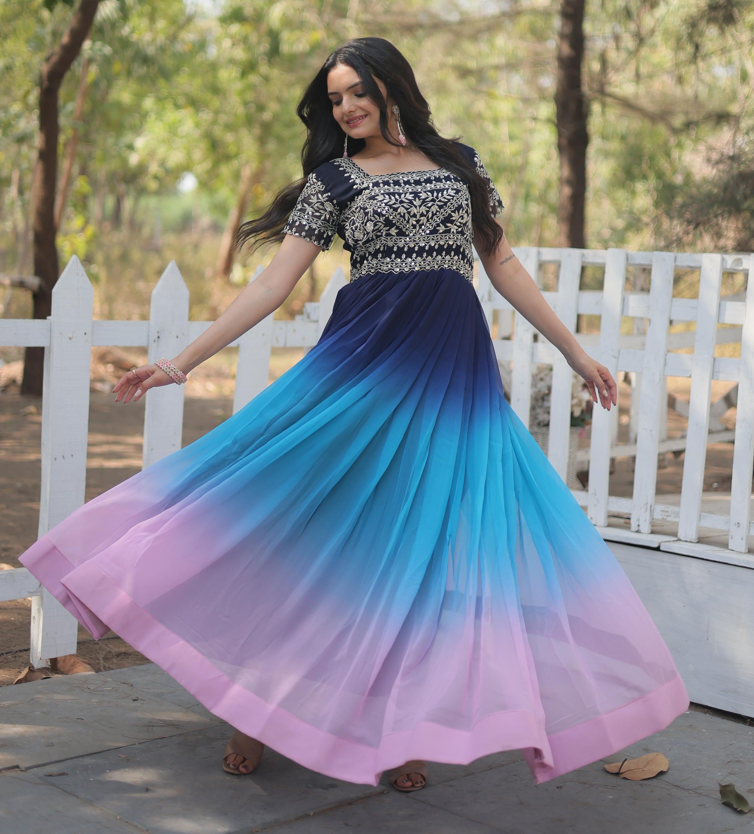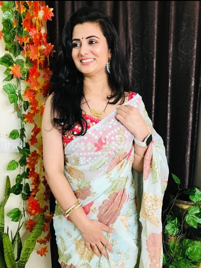 White & Blue Soft Space Silk with Printed Sequins Embroidery Work Saree