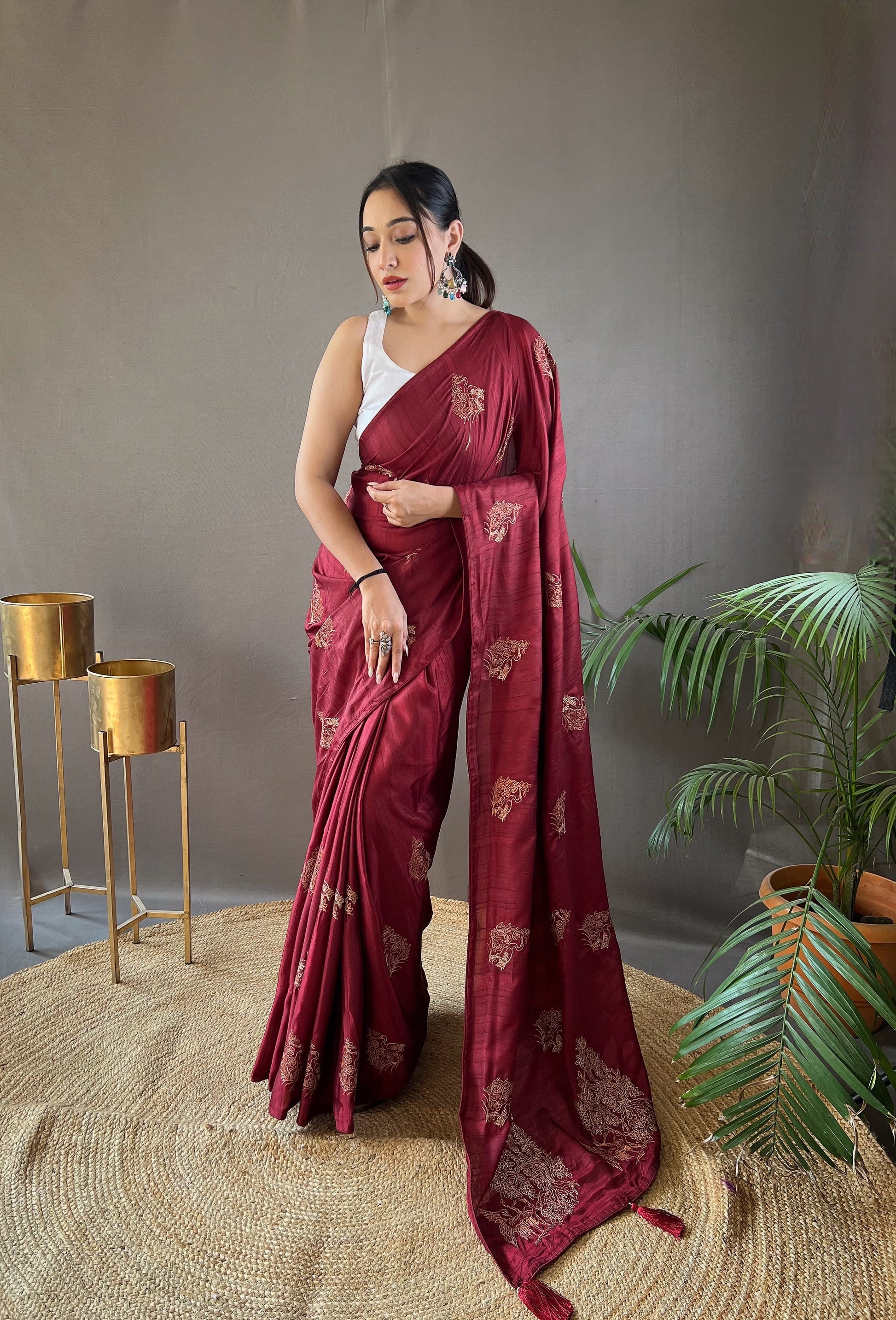 MAROON COLOR ZARI BASED EMBROIDRY AND PIPING SILK SAREE