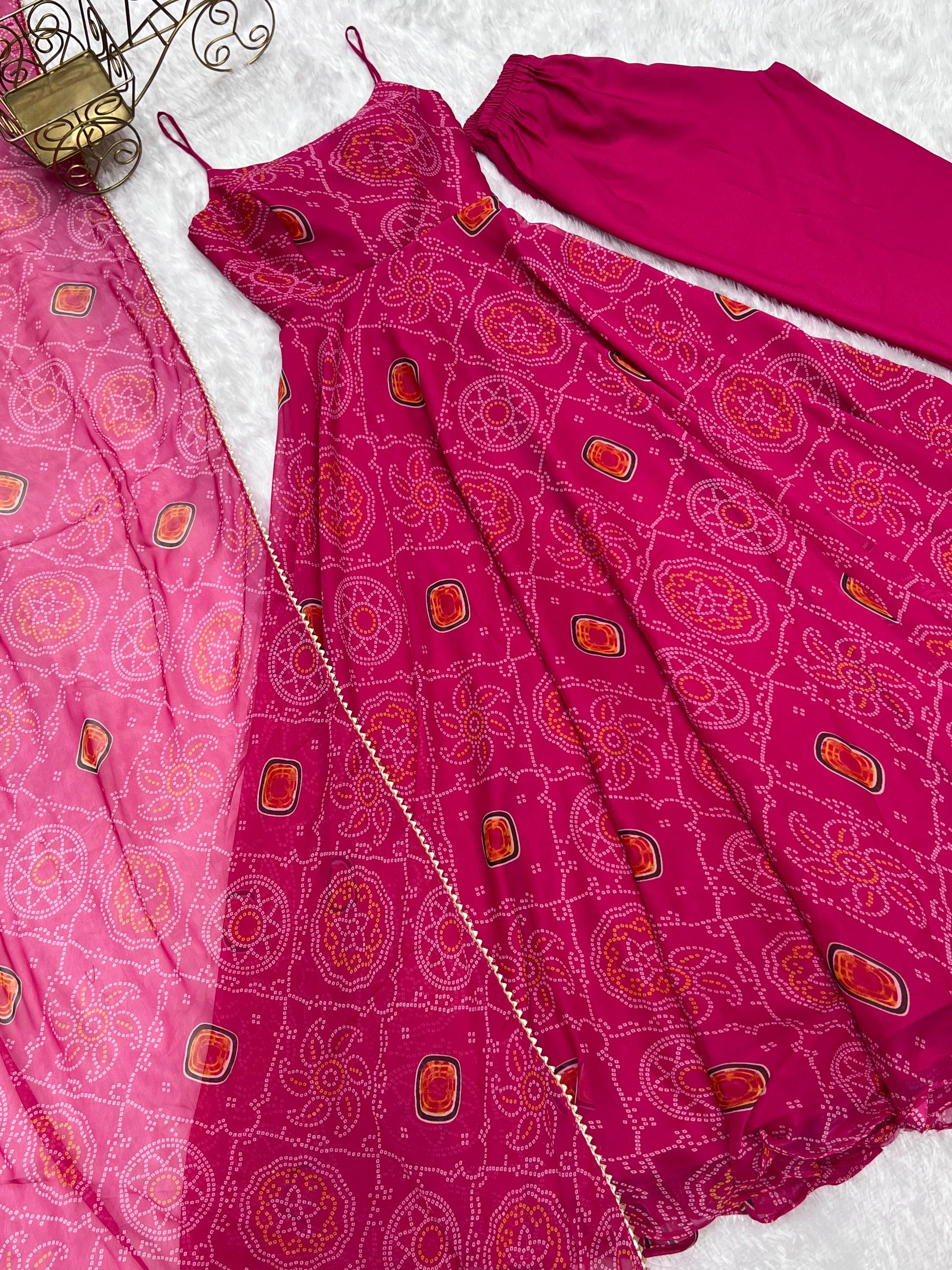 SOFT LIGHT WEIGHT CHIFFON GREEN BANDHANI PRINT ANARKALI 3PC KURTA SET