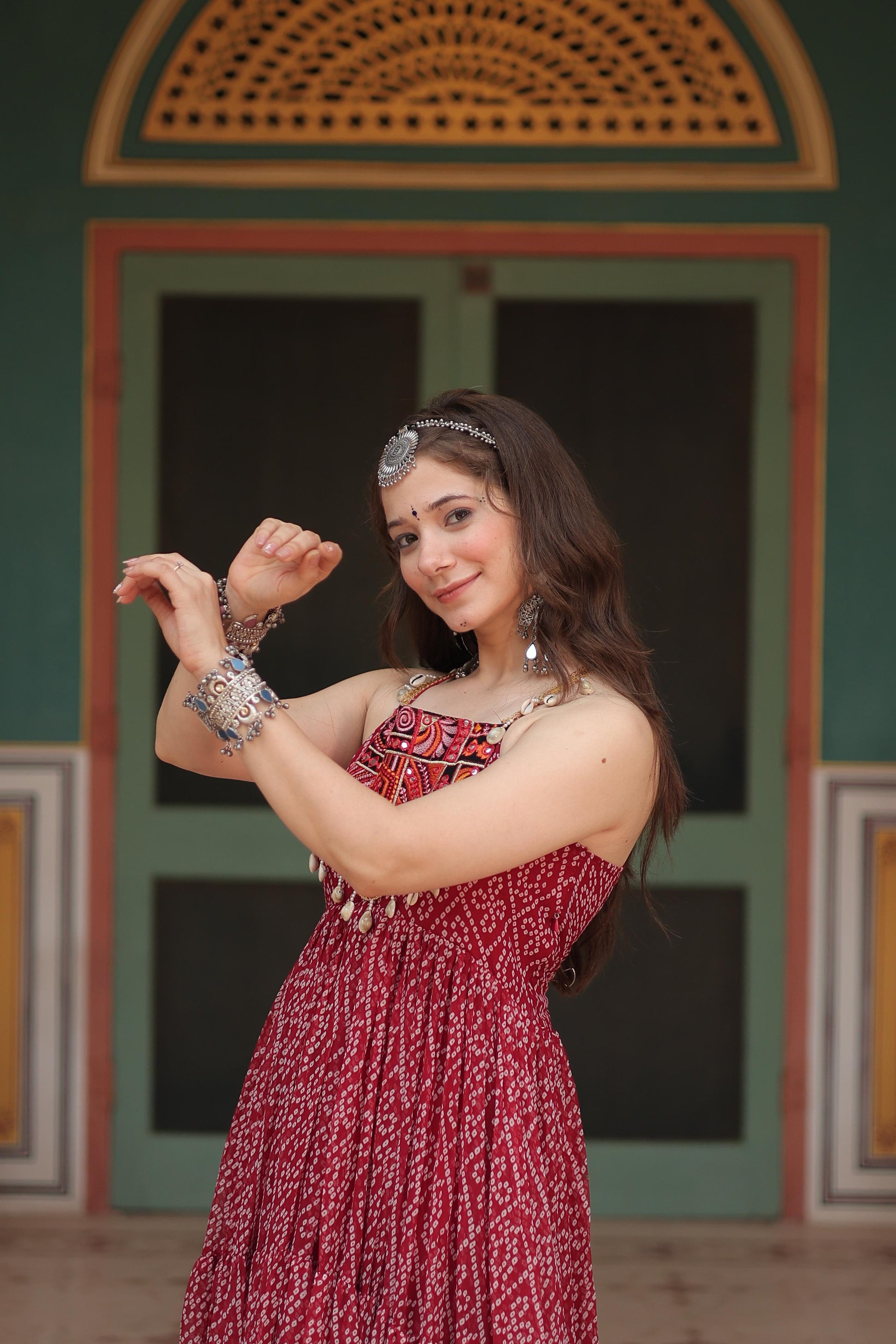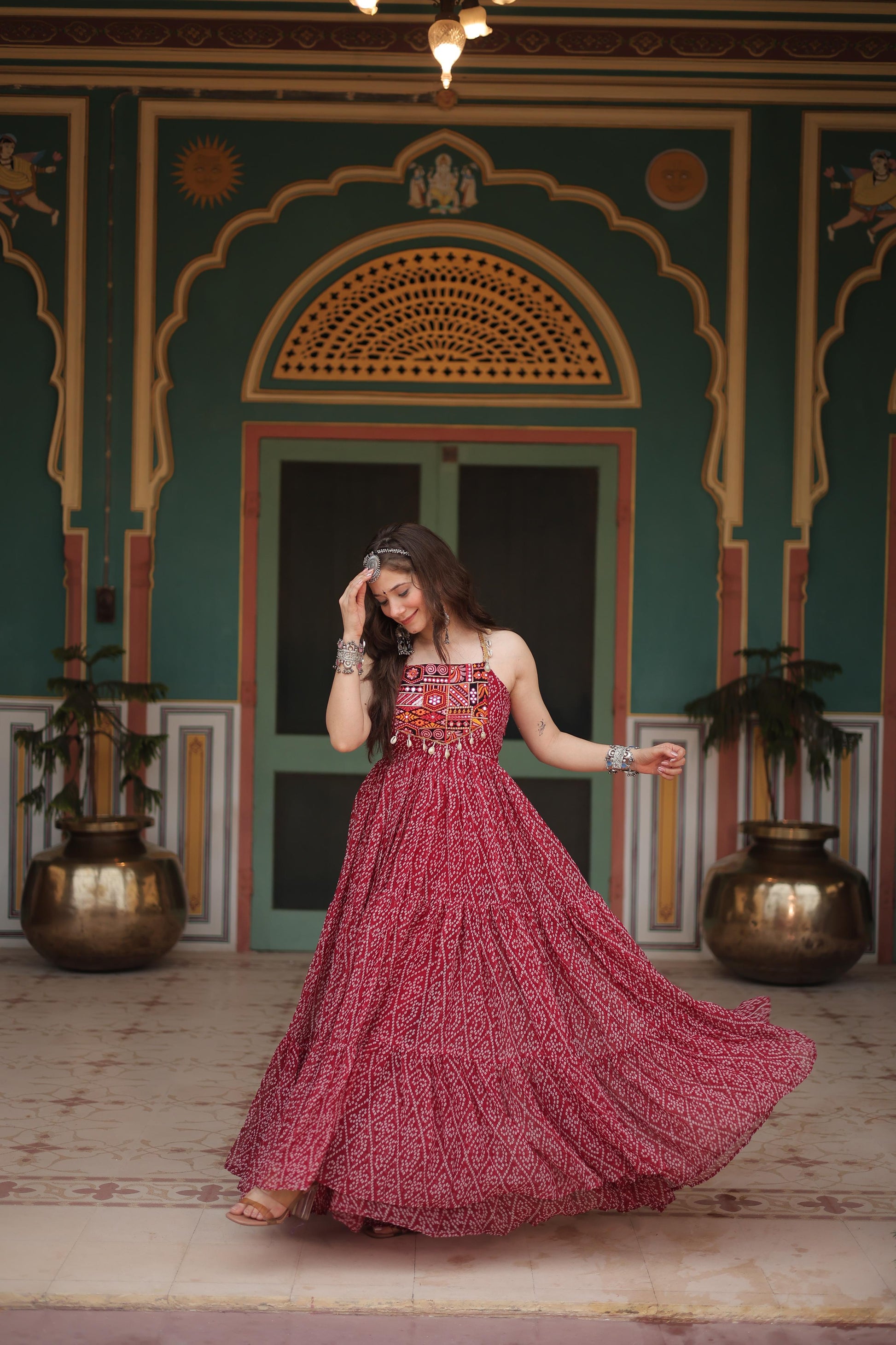 - Fabrics & Work: Bandhani Print Work with Kutchi Patchwork in Faux Georgette