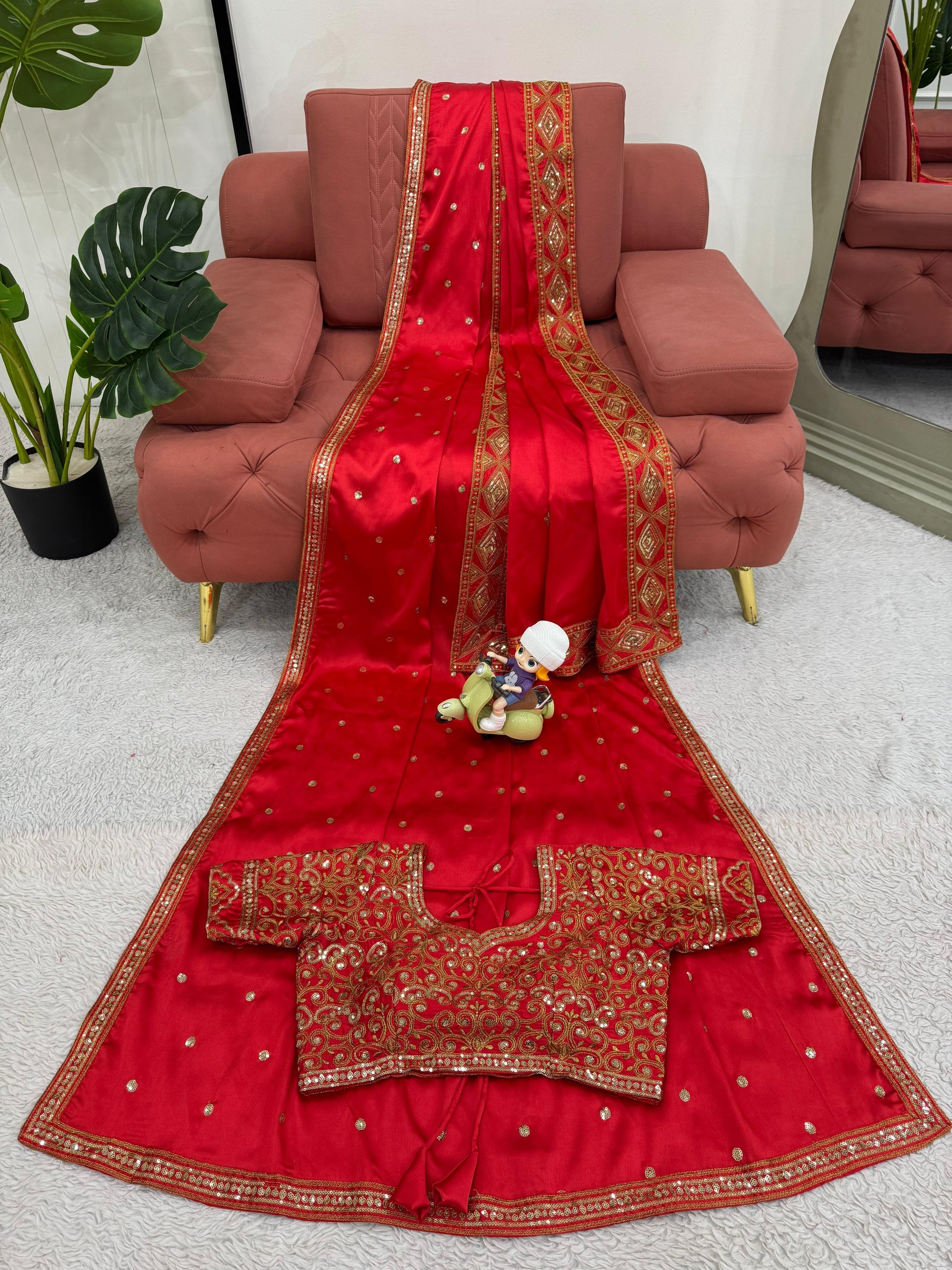 Beautiful Red Japan Satin Silk Saree With Dupatta