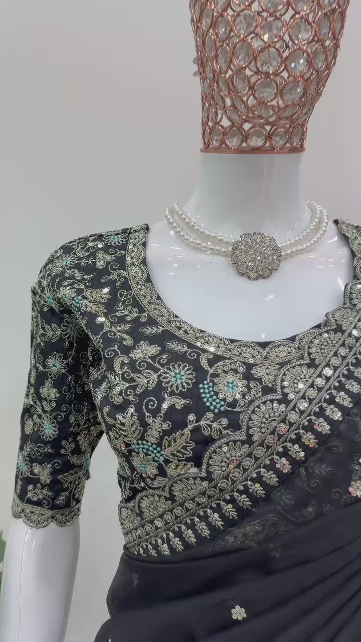 Black Heavy Tibby Silk Sequins Embroidery Saree