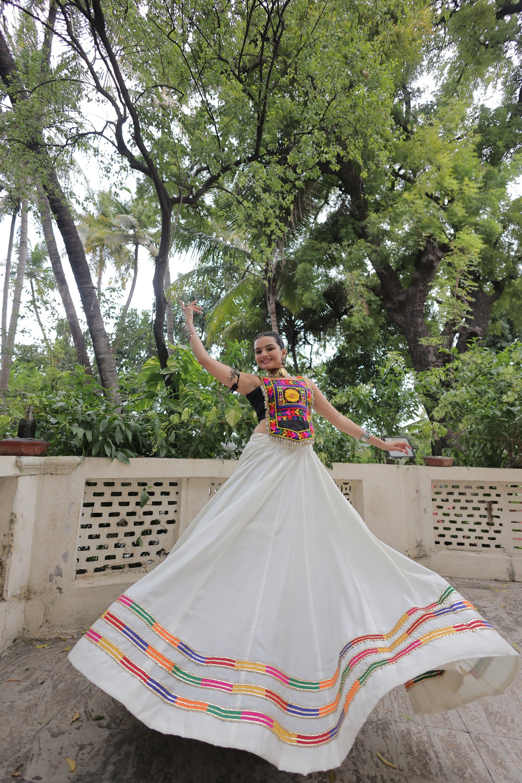 Fabric & Work: Satin with Kutchi Gamthi Embroidery, Mirror & Codi Lace Work