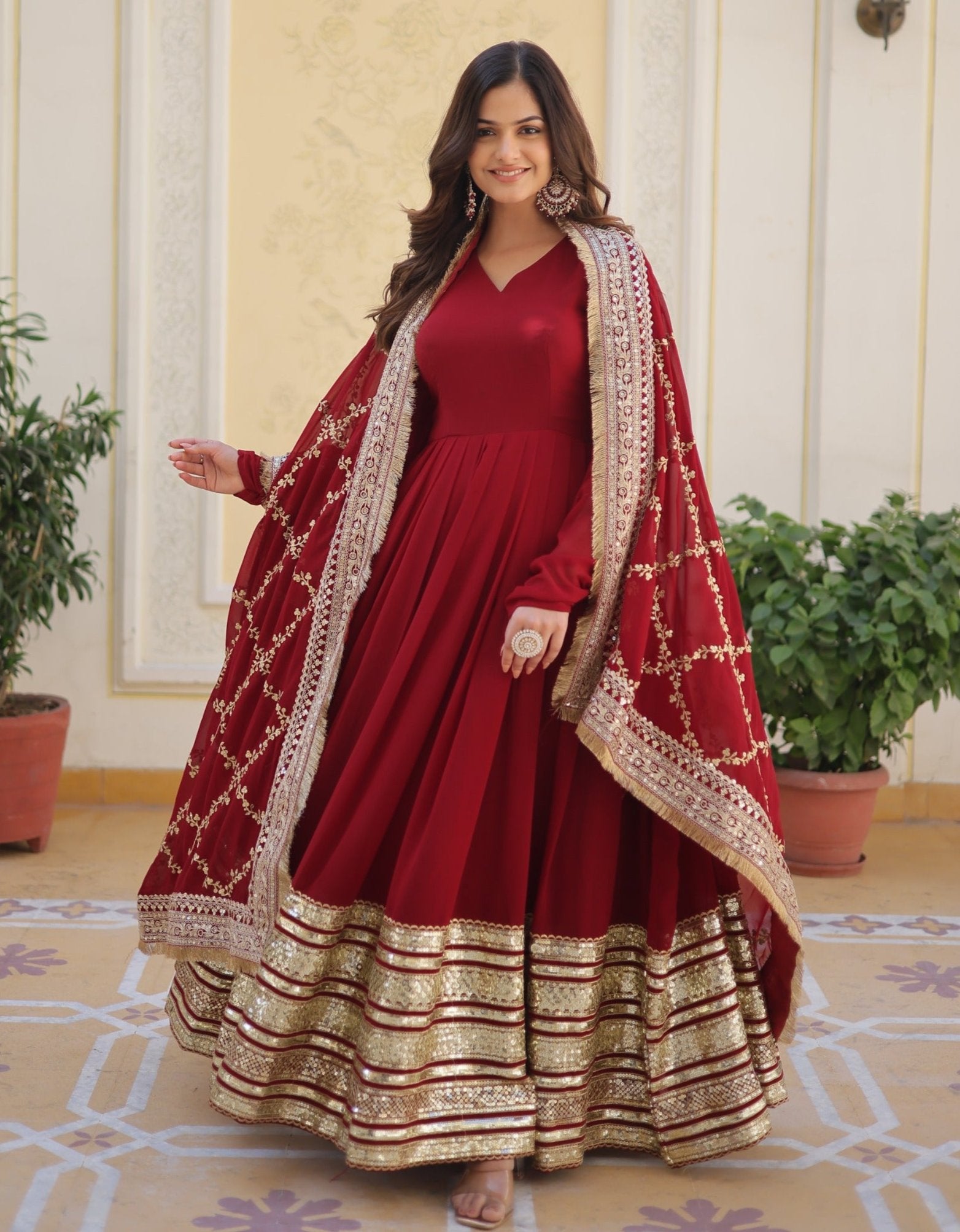 DAZZLING MAROON COLOR BLOOMING EMBROIDERY ZARI WORK ANARKALI GOWN WITH DUPATTA