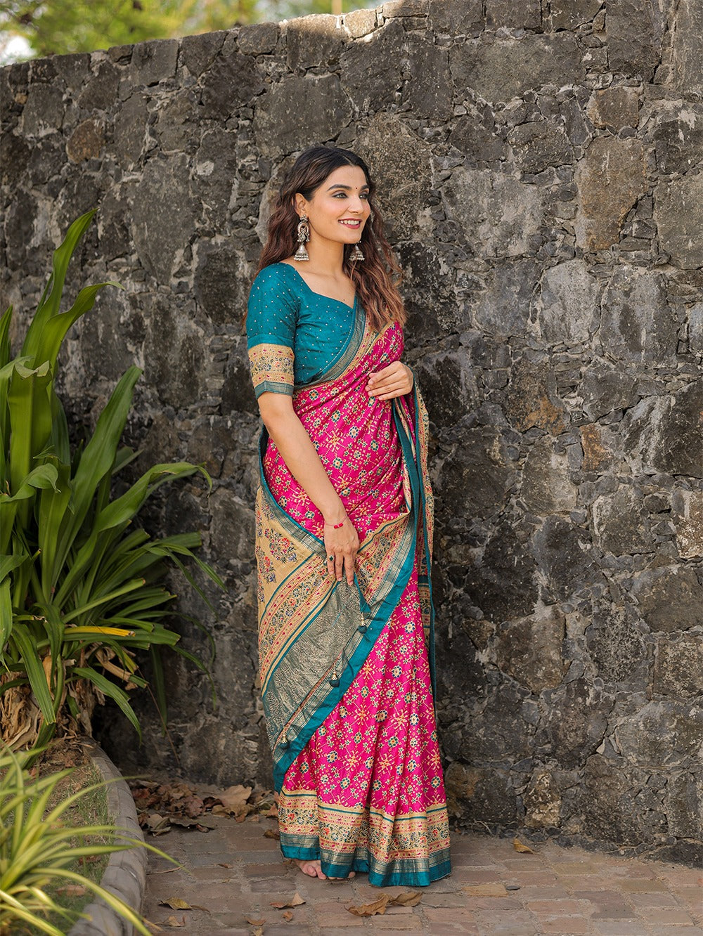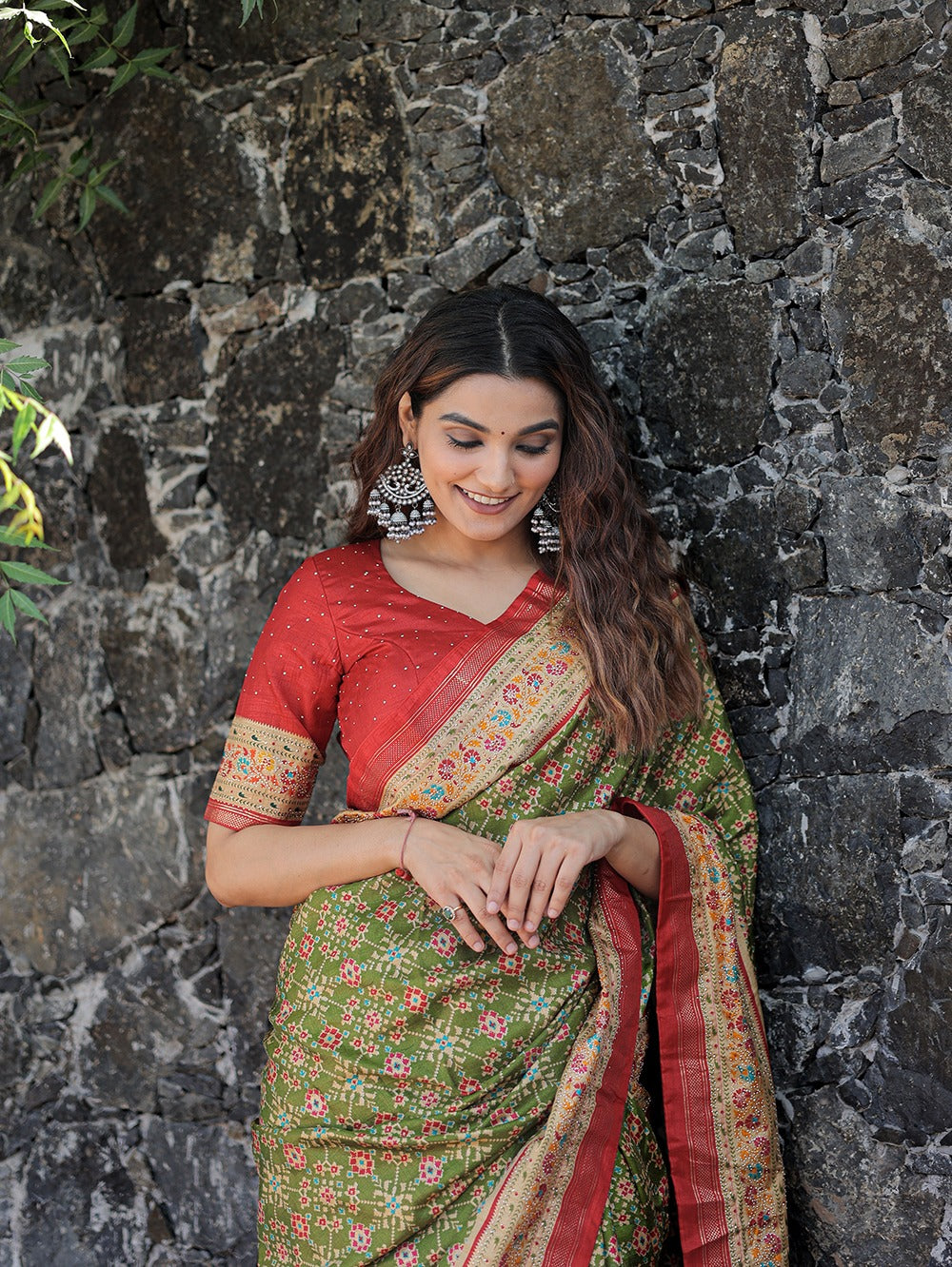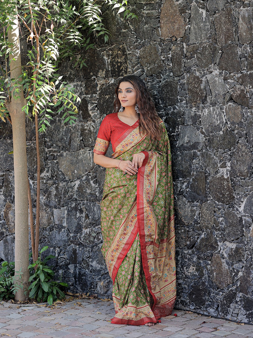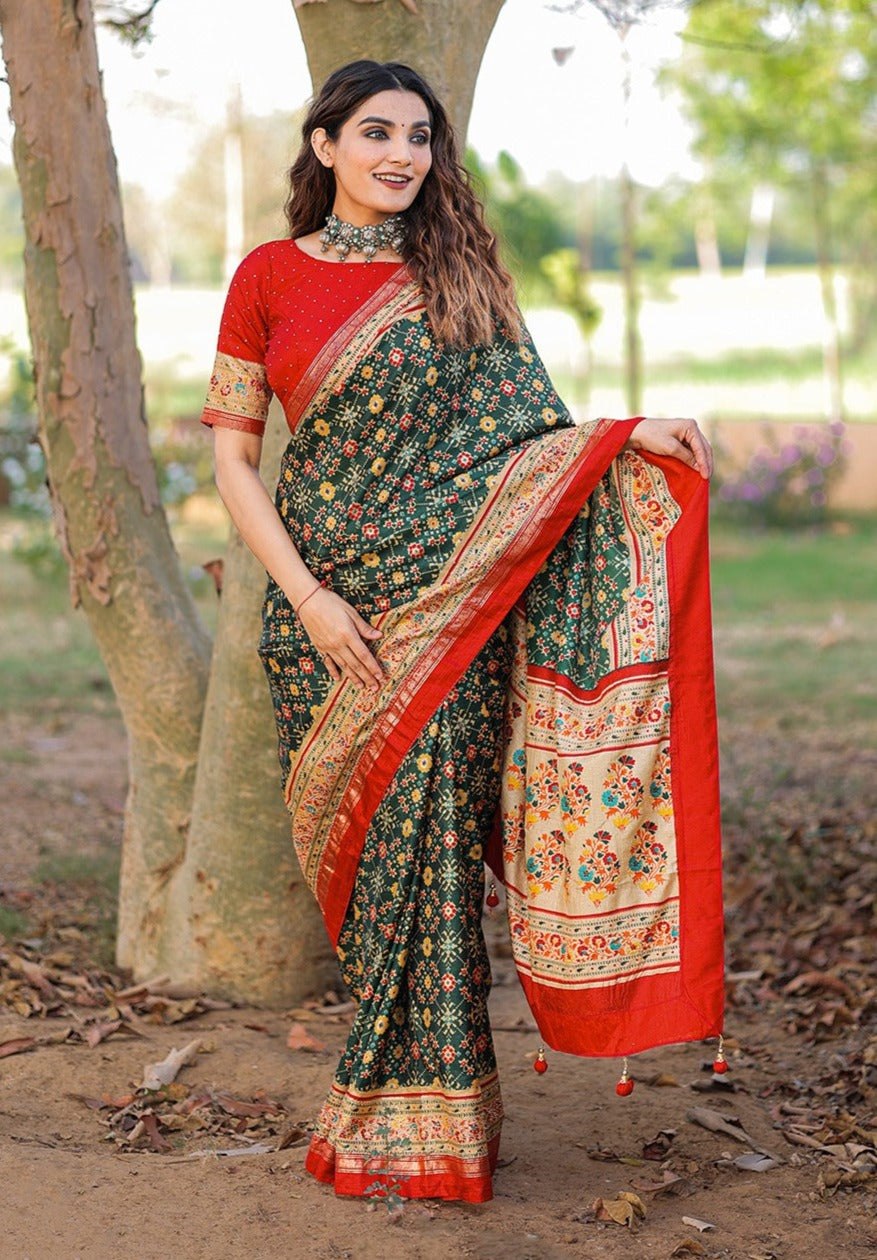 DARK GREEN DOLA SILK WITH FOIL PRINT EMBELLISHED STONE WORK SAREE