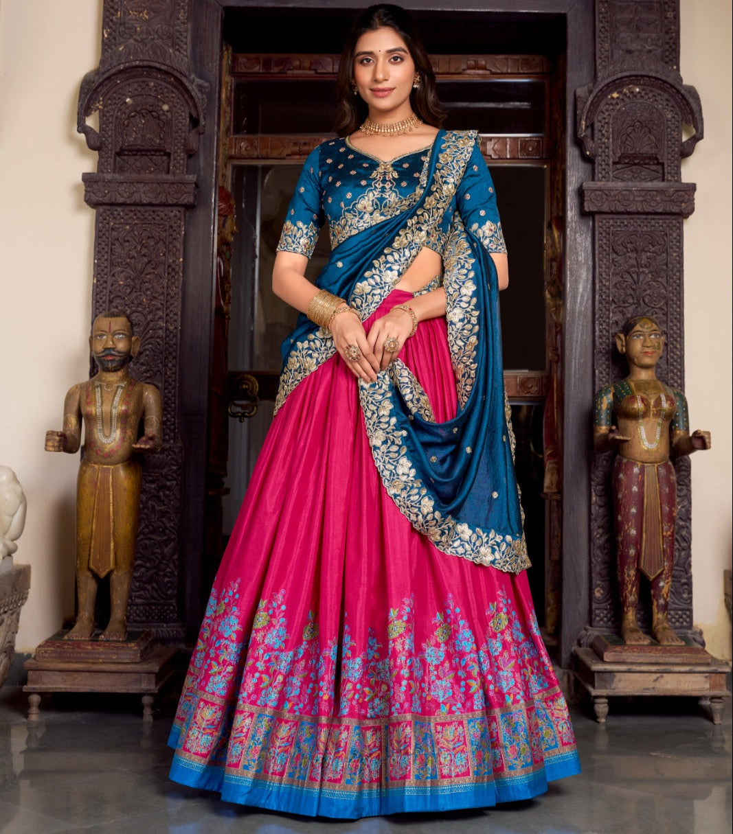 Pink color Tasar Silk Printed with Foil Work Lehenga
