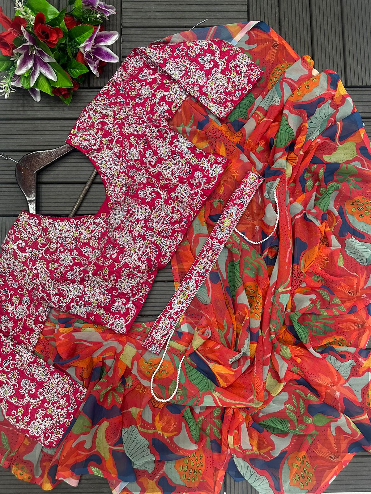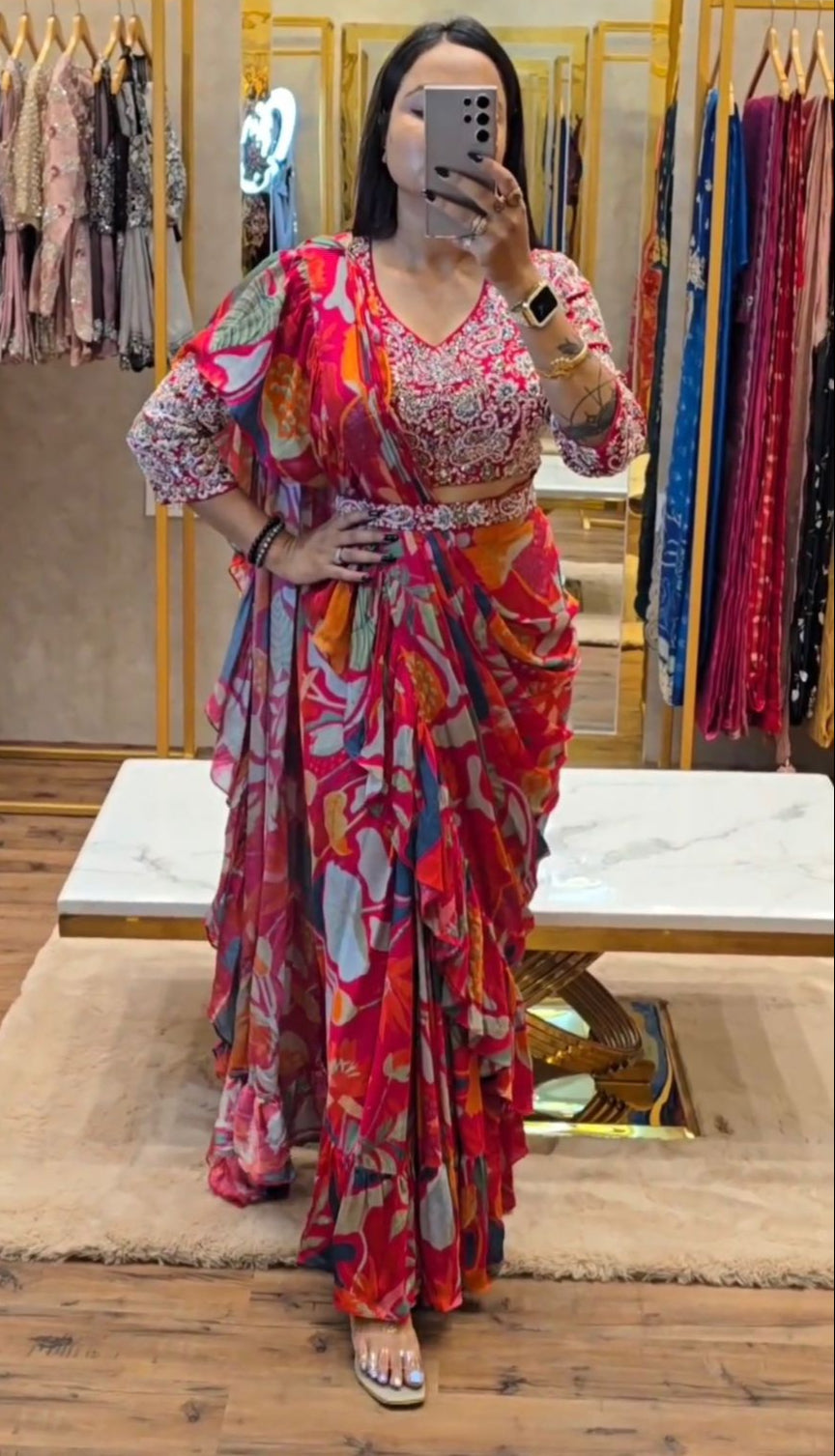 Georgette Embroidery With Digital Print Ready To Wear Saree