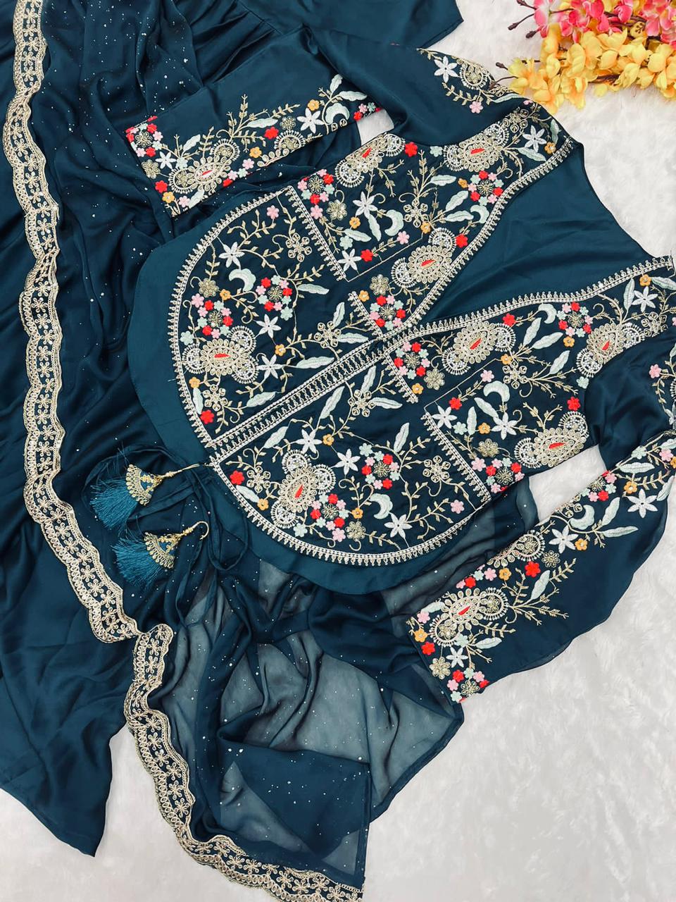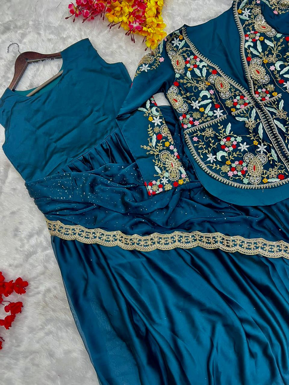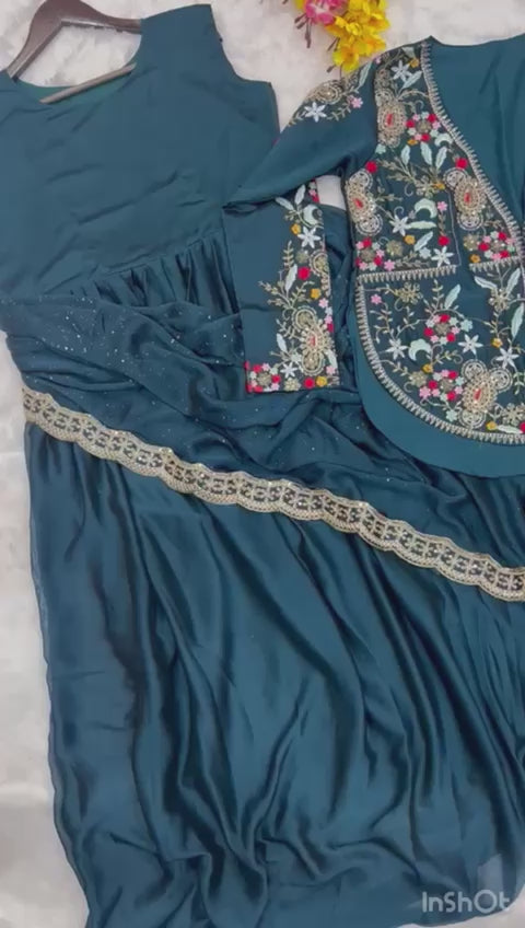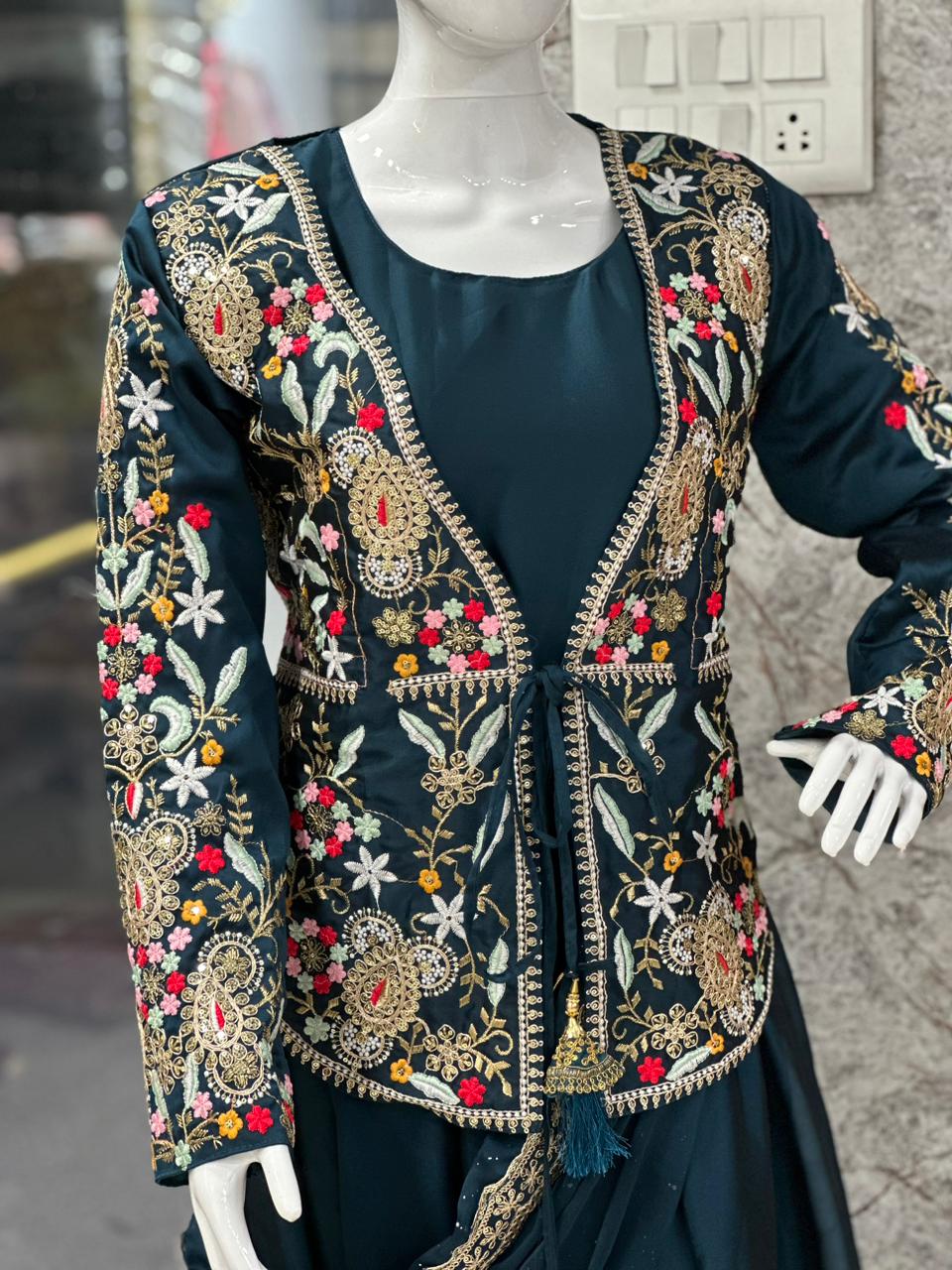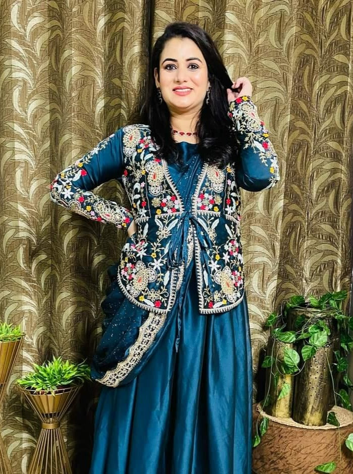 Introducing our stunning heavy rangoli gown, made with Micro Cotton inner lining for added comfort. This exquisite gown comes with a beautifully embroidered jacket, fully stitched in size XL with a margin of up to 2XL. The gown boasts a generous 3.5mtr flair and weighs 1kg. Perfect for any special occasion, order yours today and make a statement wherever you go!