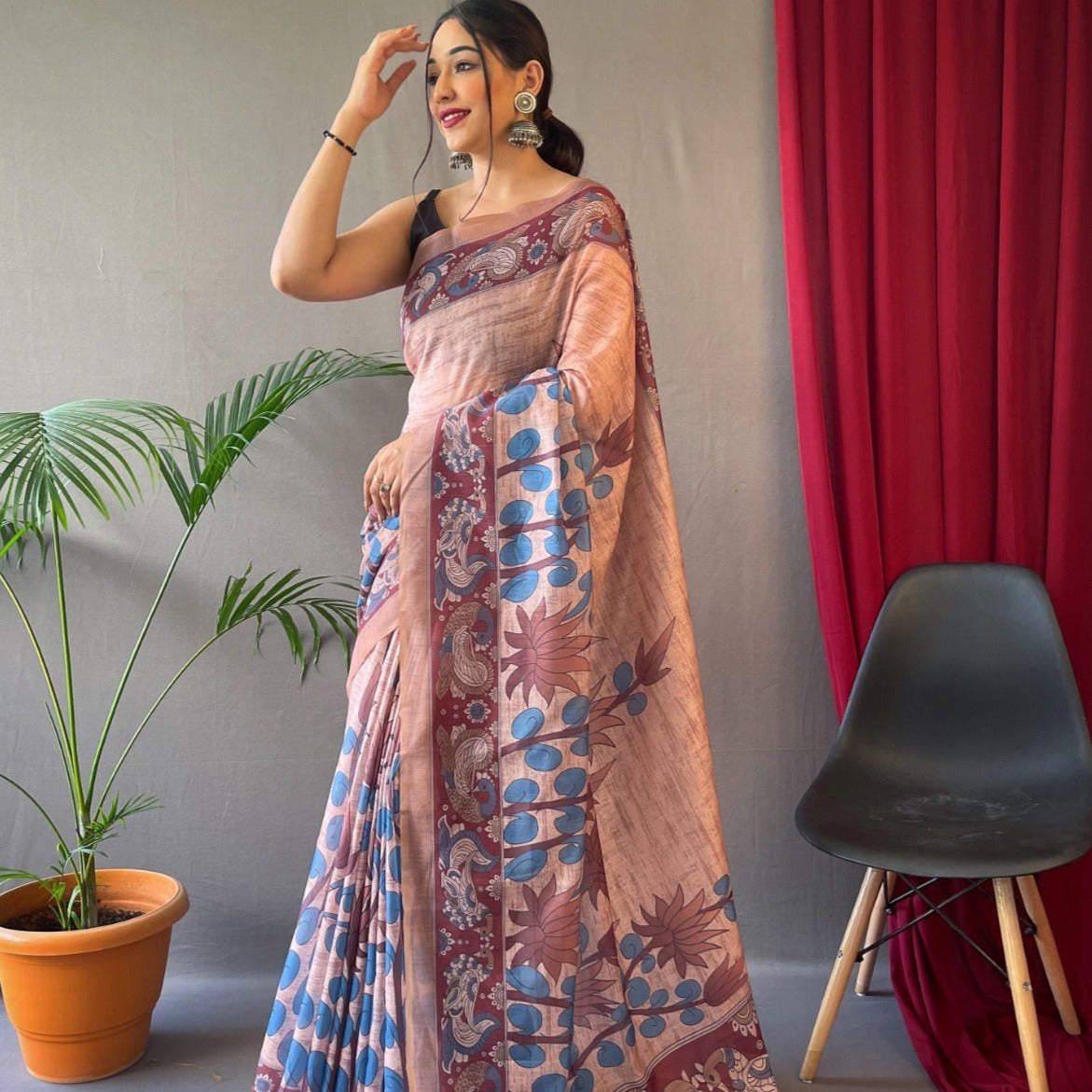 PASTEL PINK COLOR PURE MALAI COTTON WITH KALAMKARI PRINT SAREE