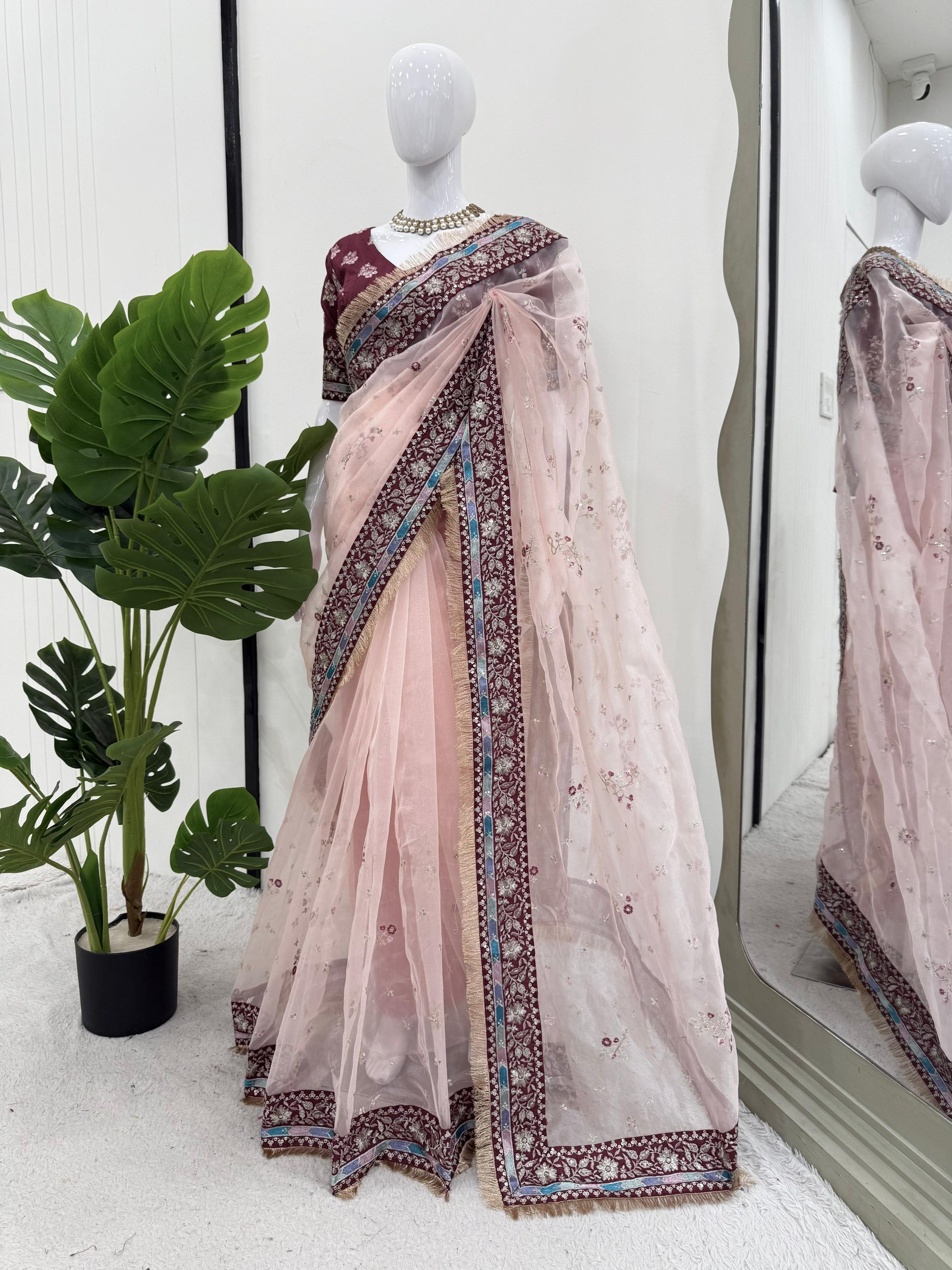 Light Pink Heavy Organza Silk With Thread Work Saree