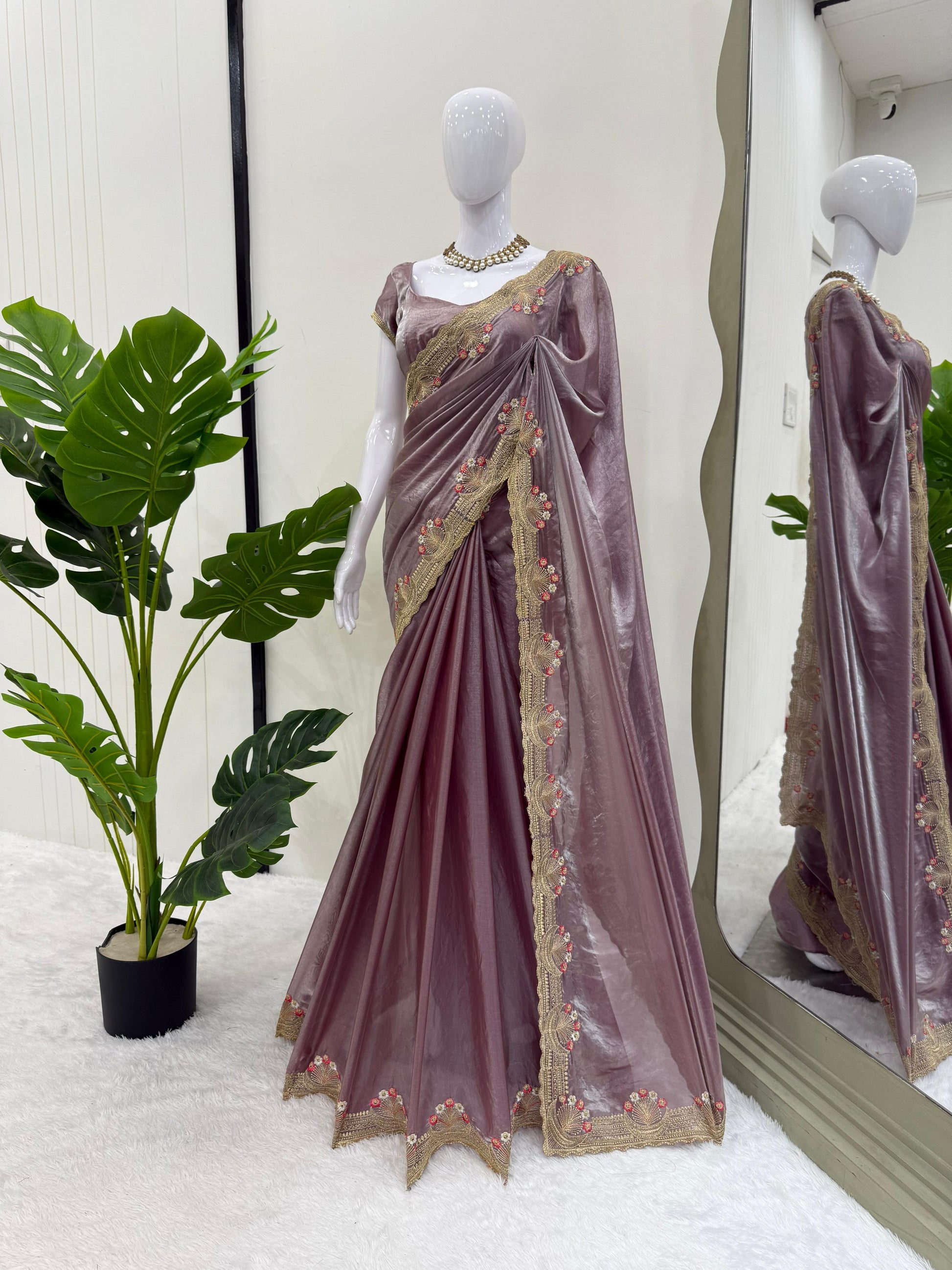Onion color Fendi Silk Intricate Embroidery Work Saree