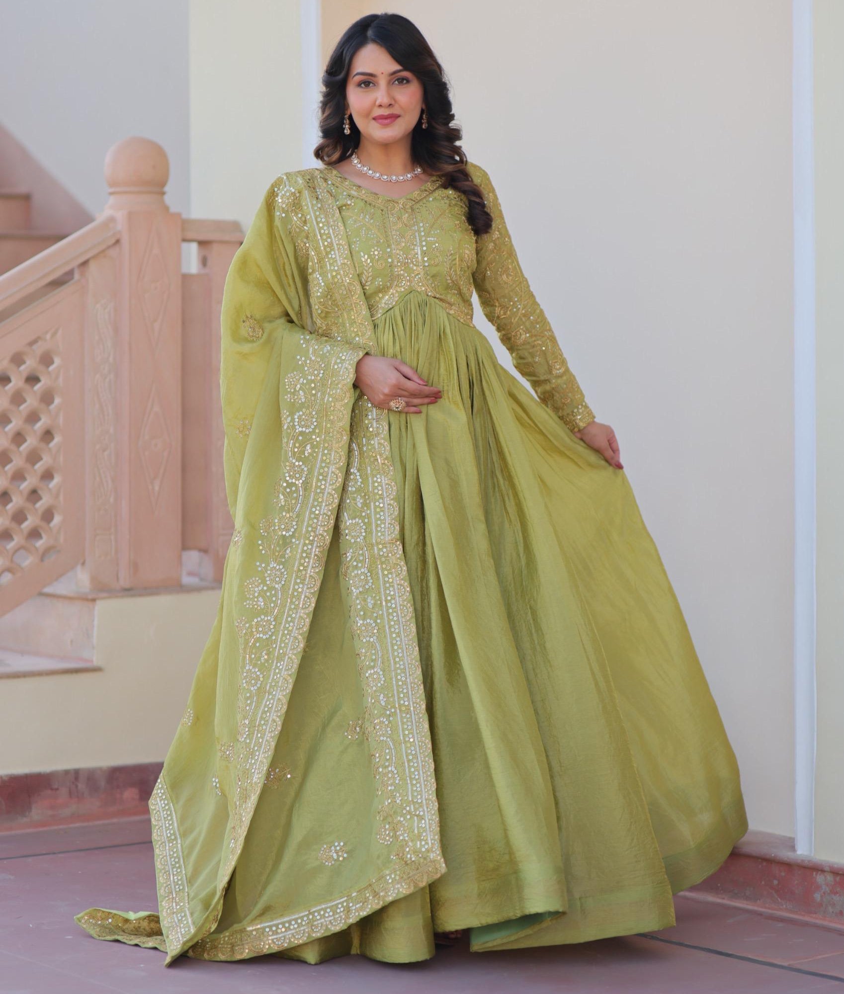 Parrot Green Gold-Crush Fabric with Sequins Work Gown With Dupatta