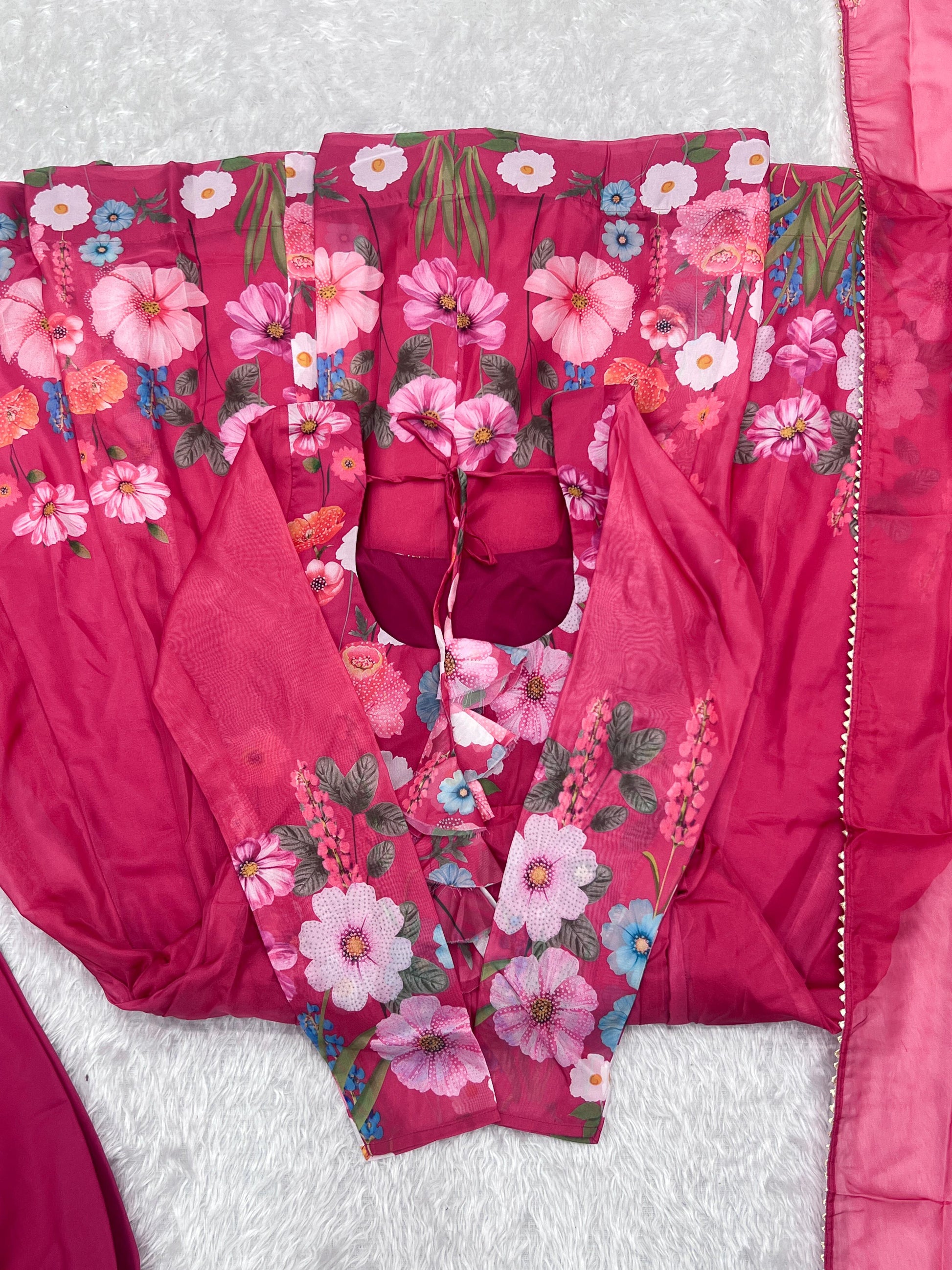 Pink Color Floral Print Organja Anarkali 3PC Kurta Set