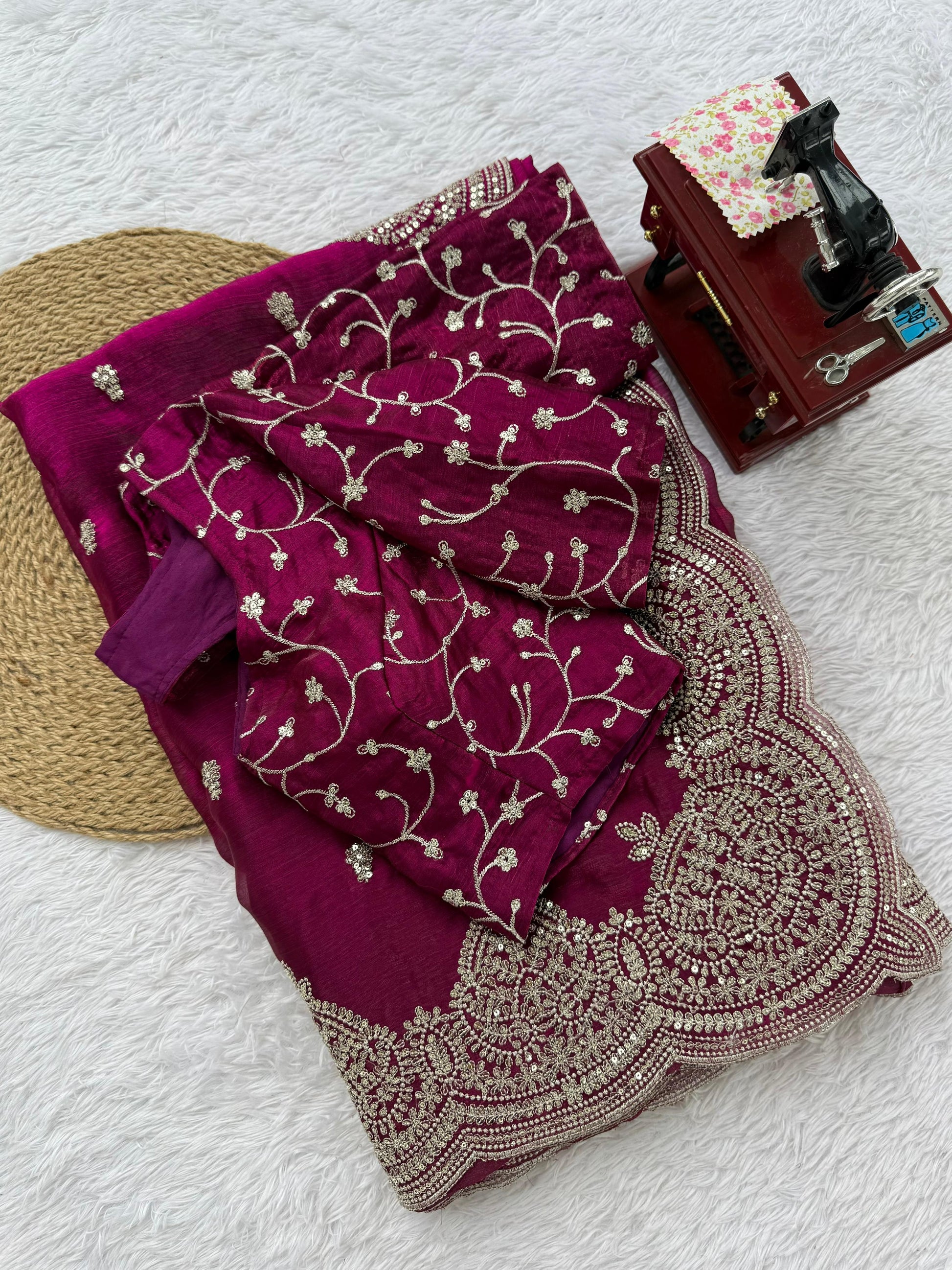 Pink Fendi Chiffon Intricate Thread Embroidery Work Saree