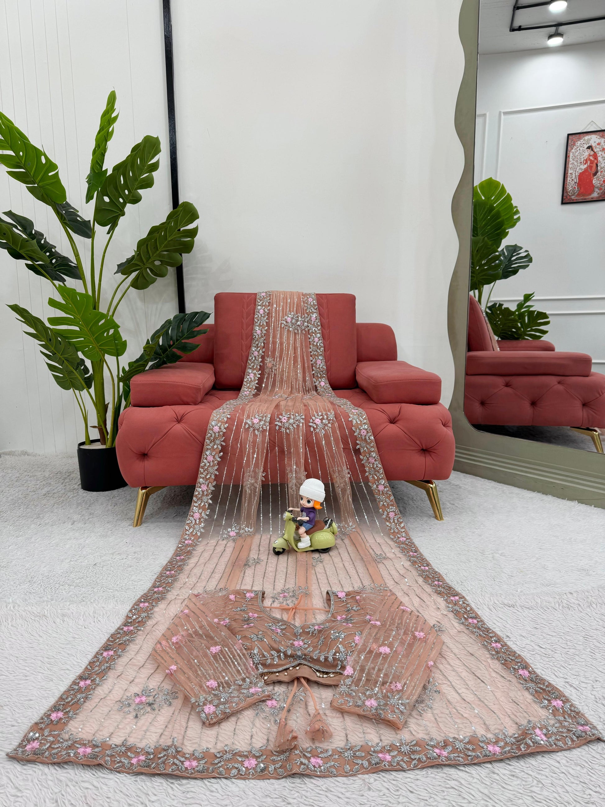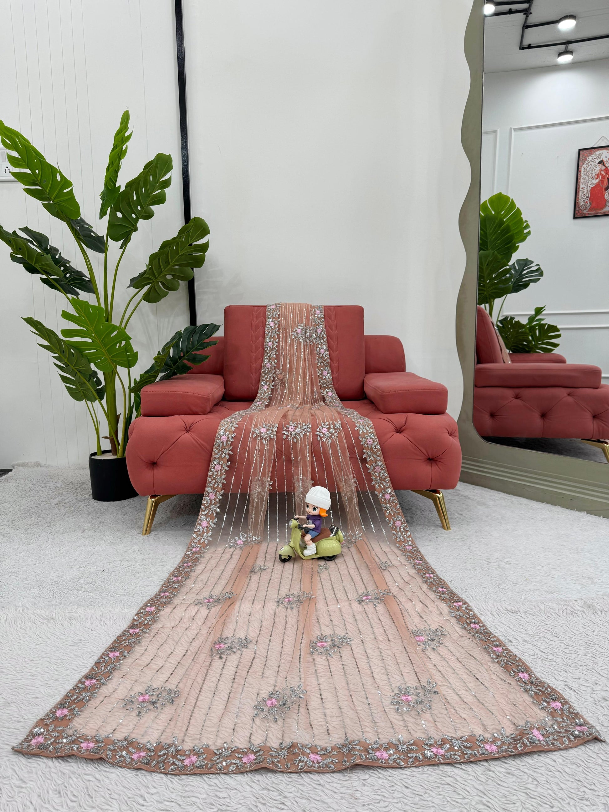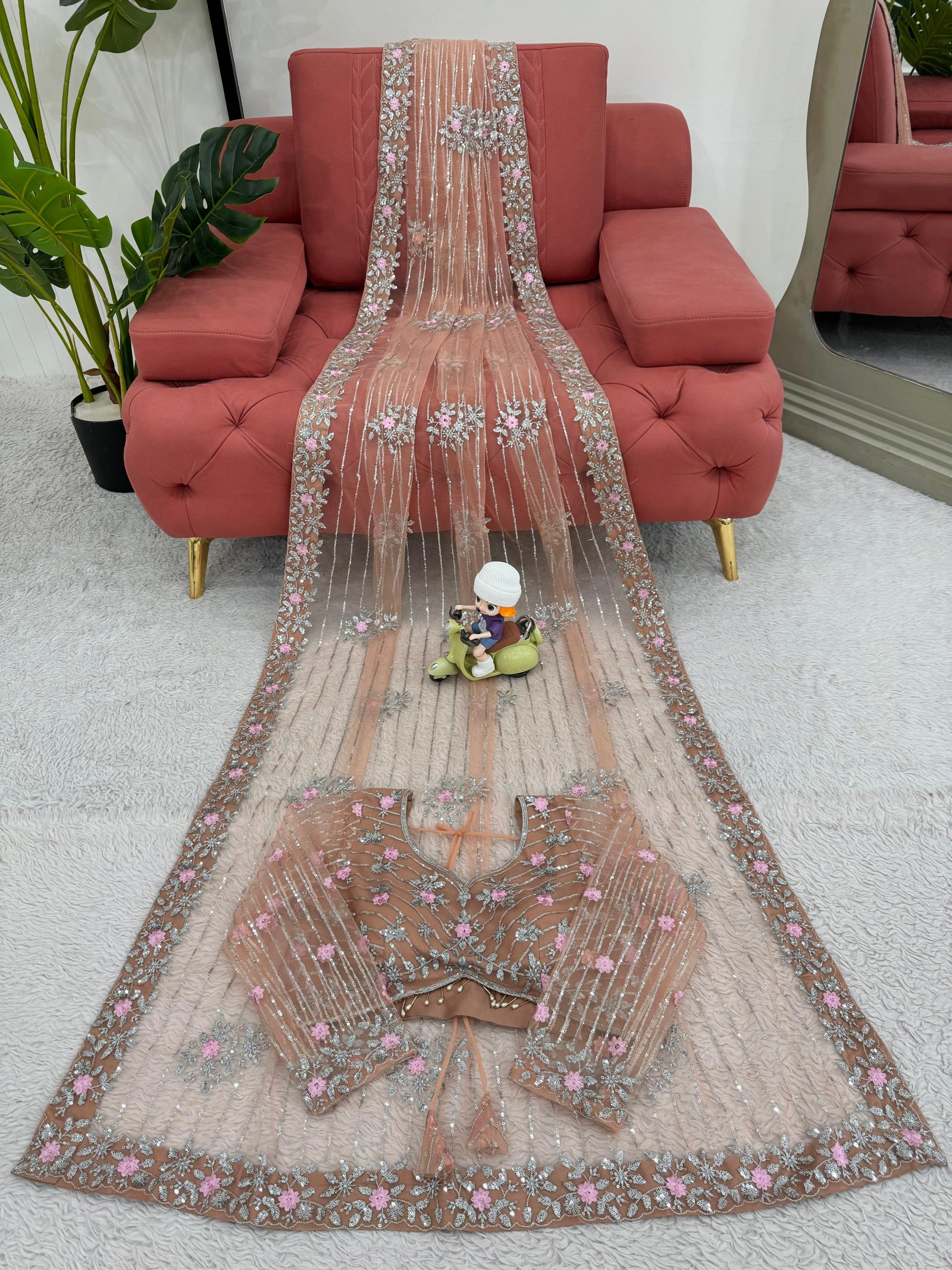 Pink Orange Soft Net Sequin Embroidered