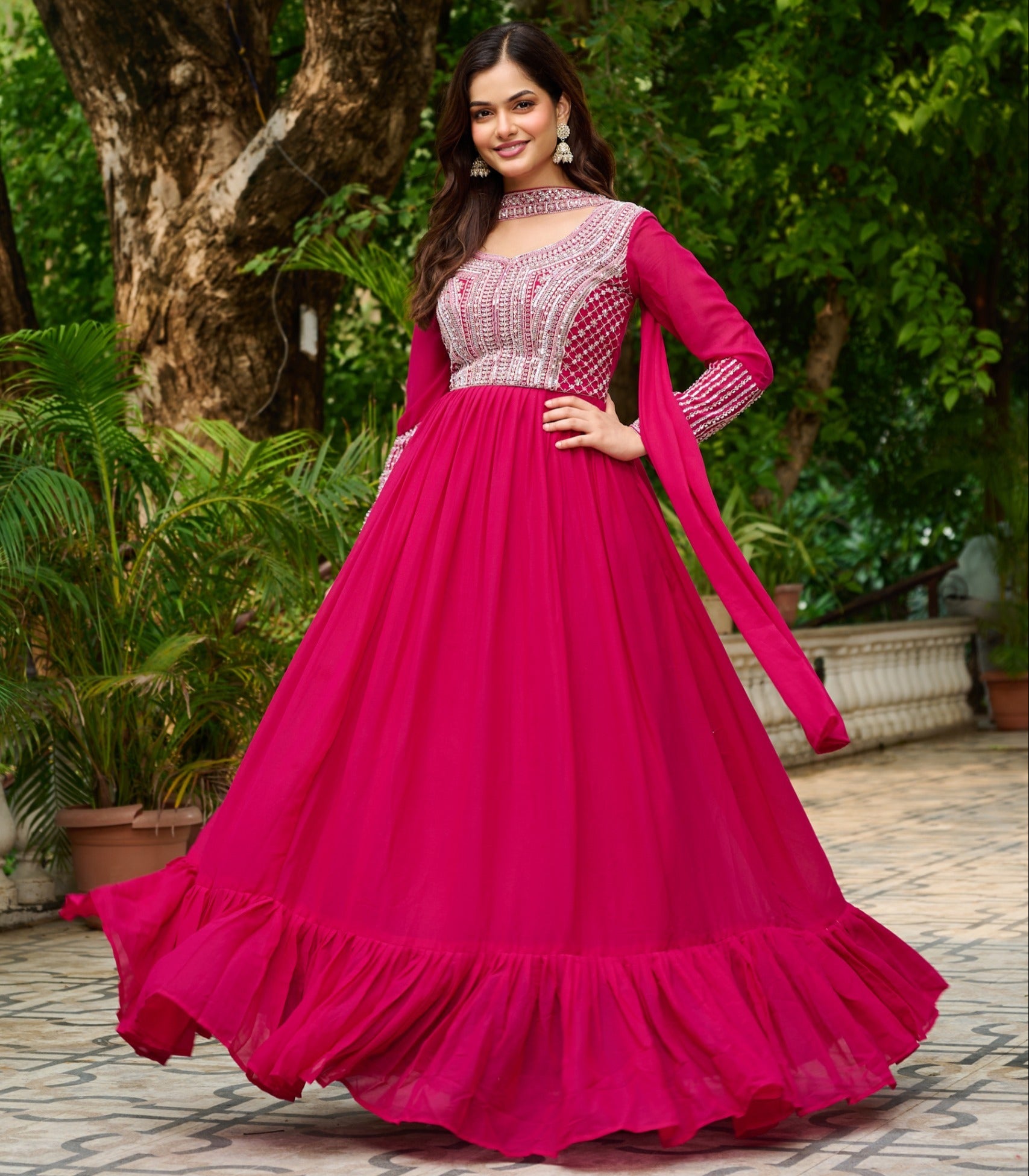 Pink Star Georgette Sequins Work Gown With Dupatta