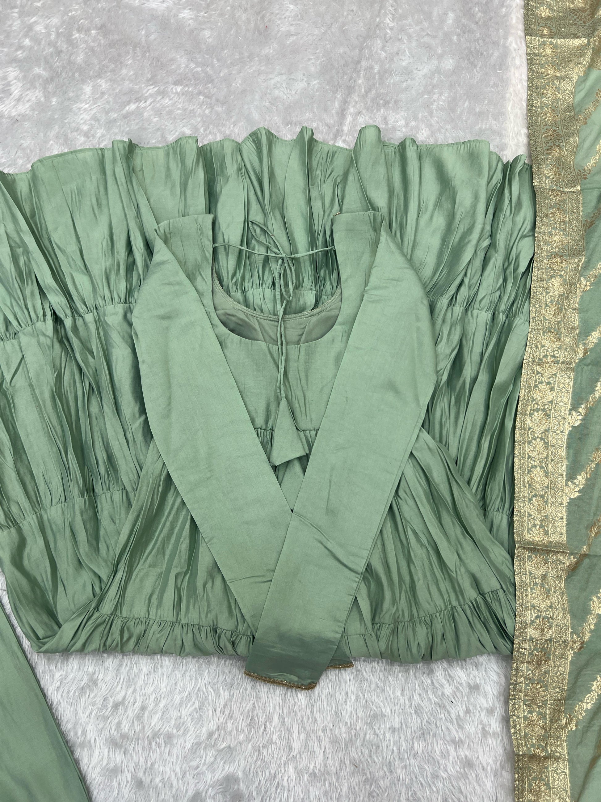 Pista Heavy Romansilk Chanderi With Yoke Lace 3pc Kurta Set