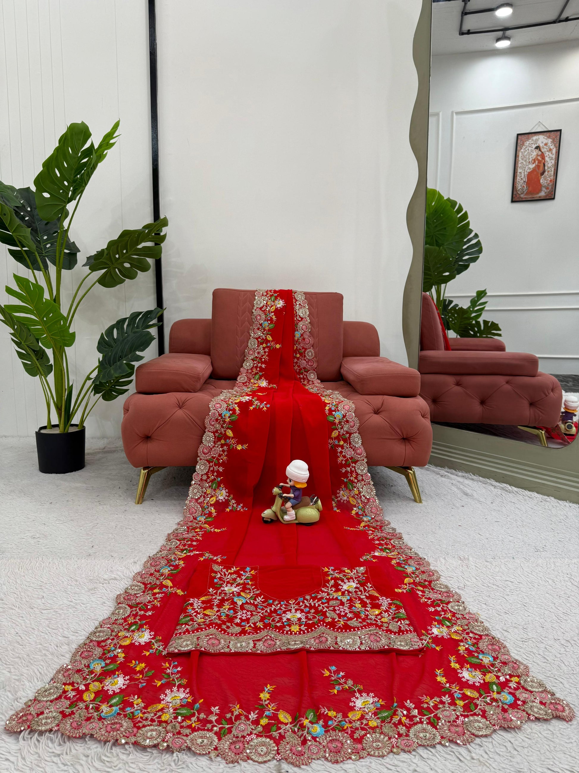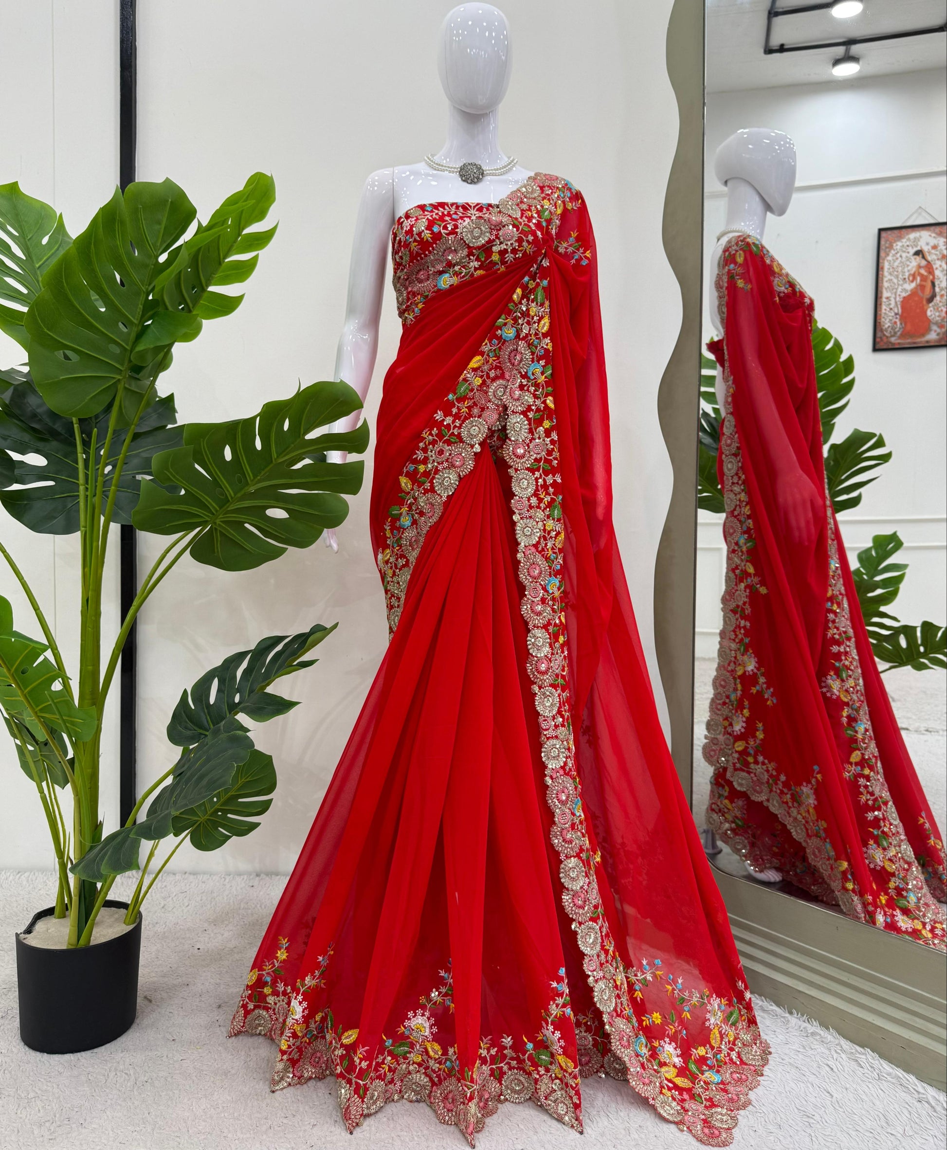 Red Faux Georgette Thread & Sequin Work Saree