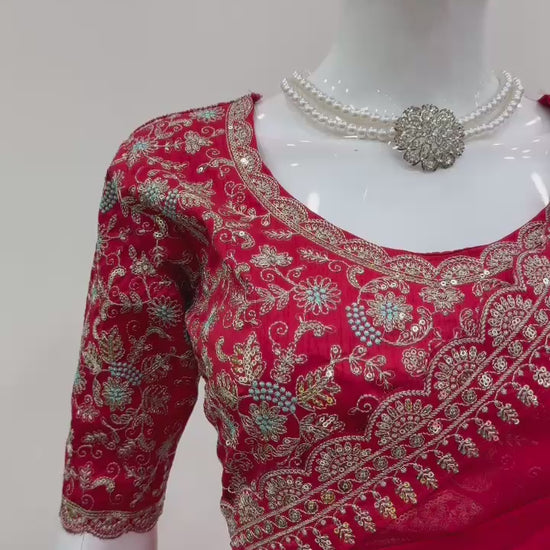 Red Heavy Tibby Silk Sequins Embroidery Saree