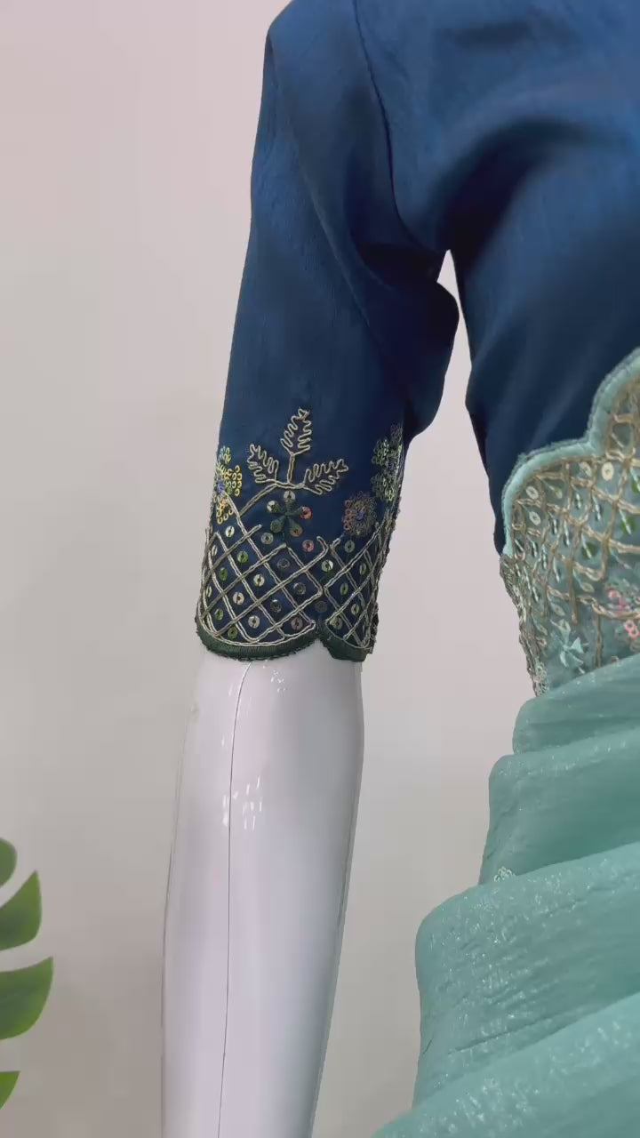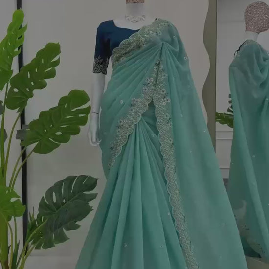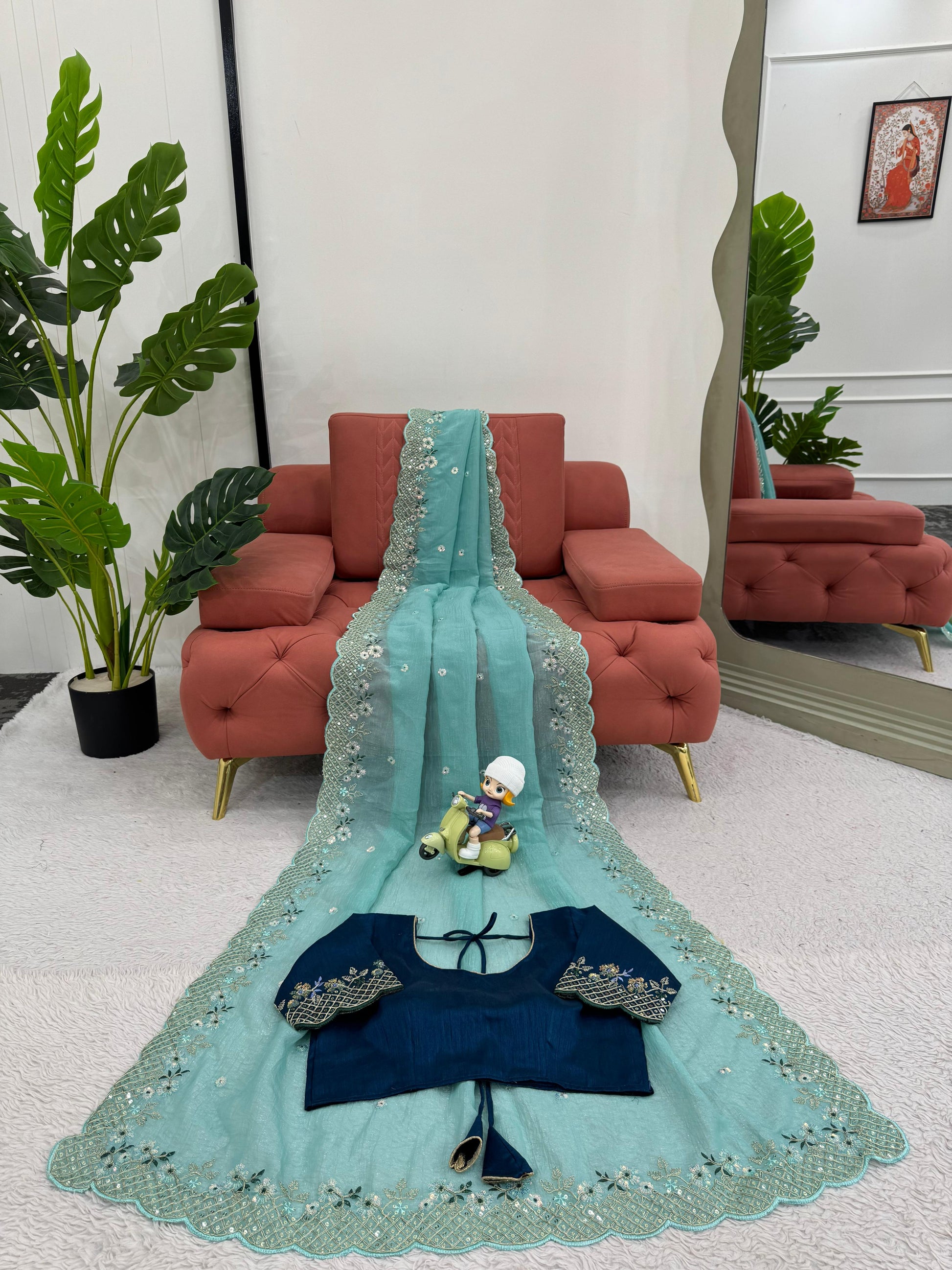 Sky Blue Crunchy Silk With Thread & Sequins Work Saree