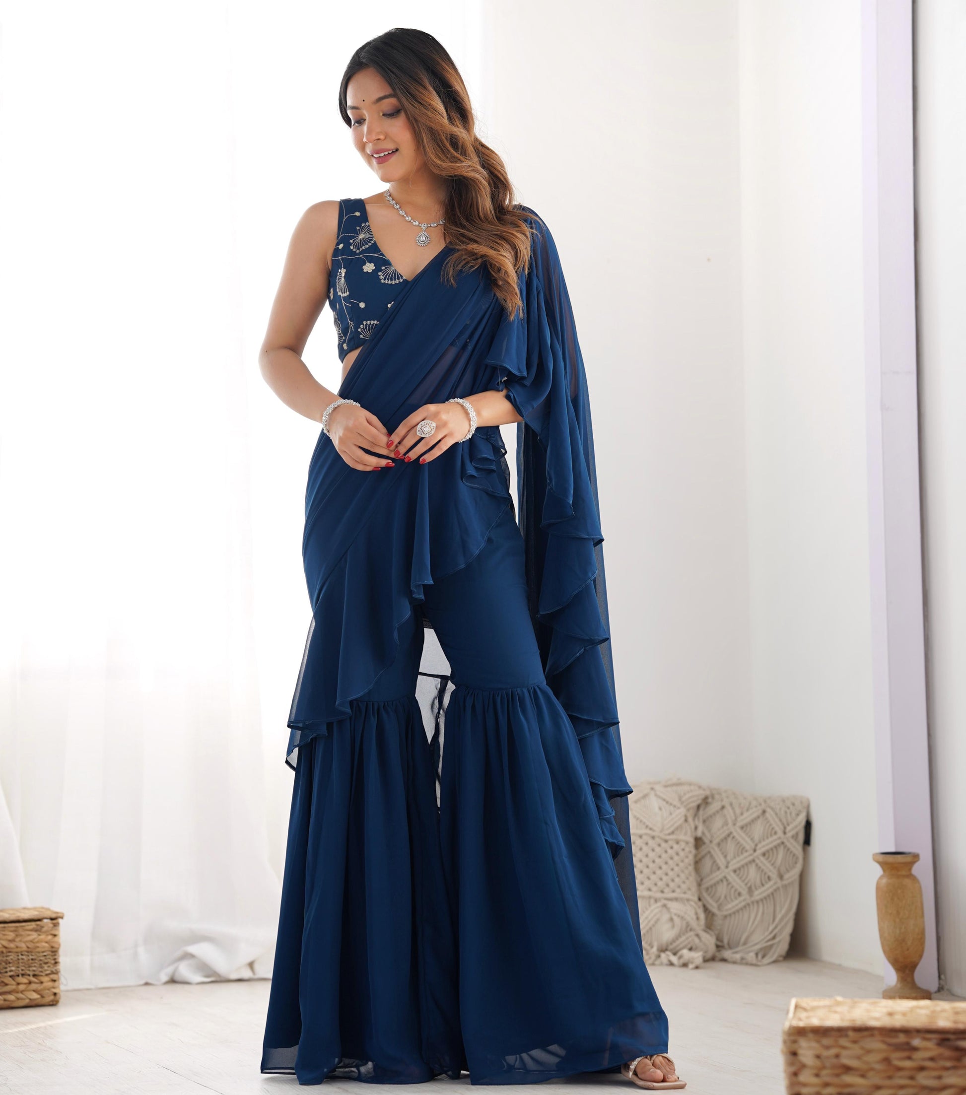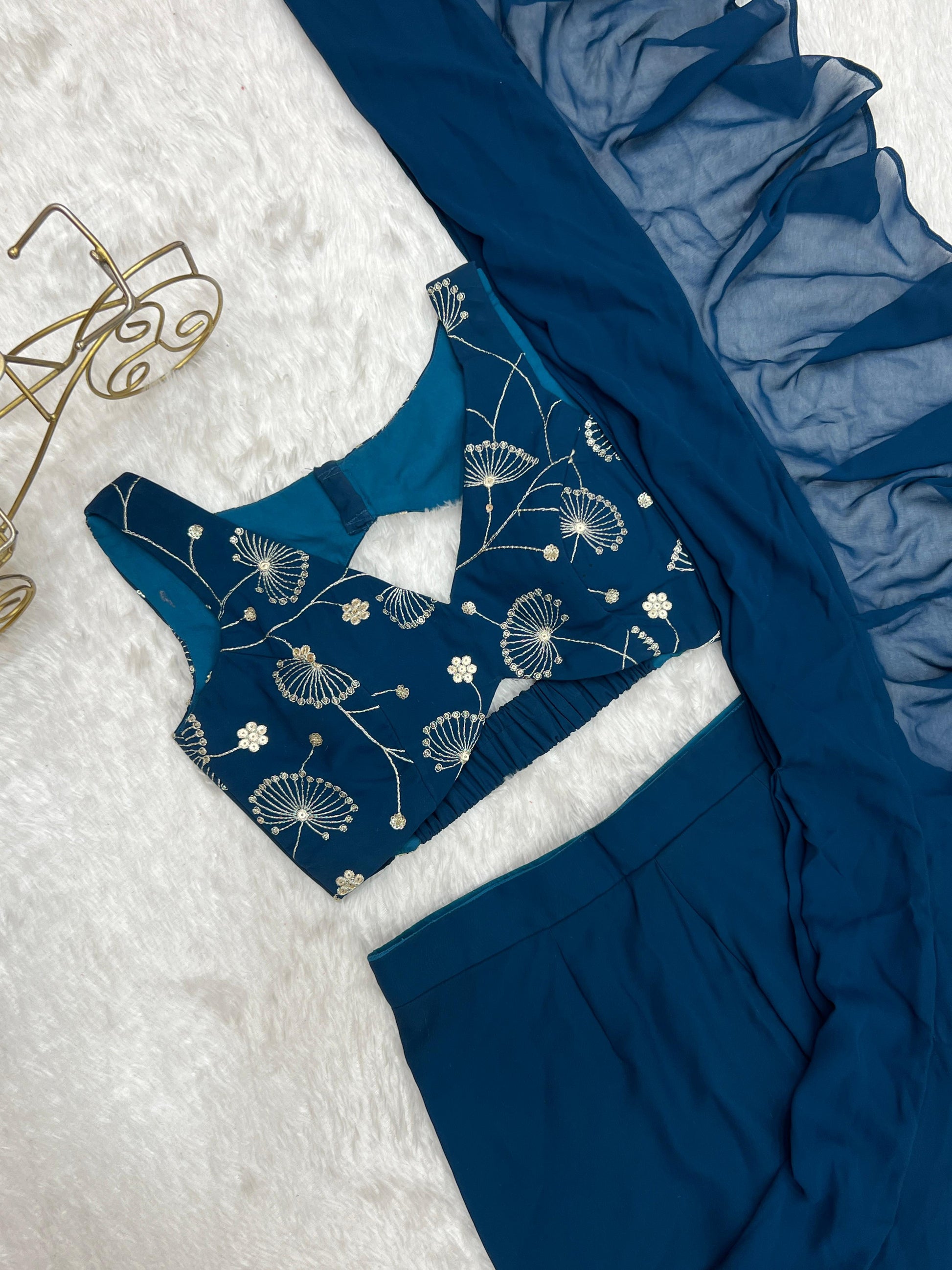 Tealblue Pure Fox Georgette Ready-to-wear Sharara Saree