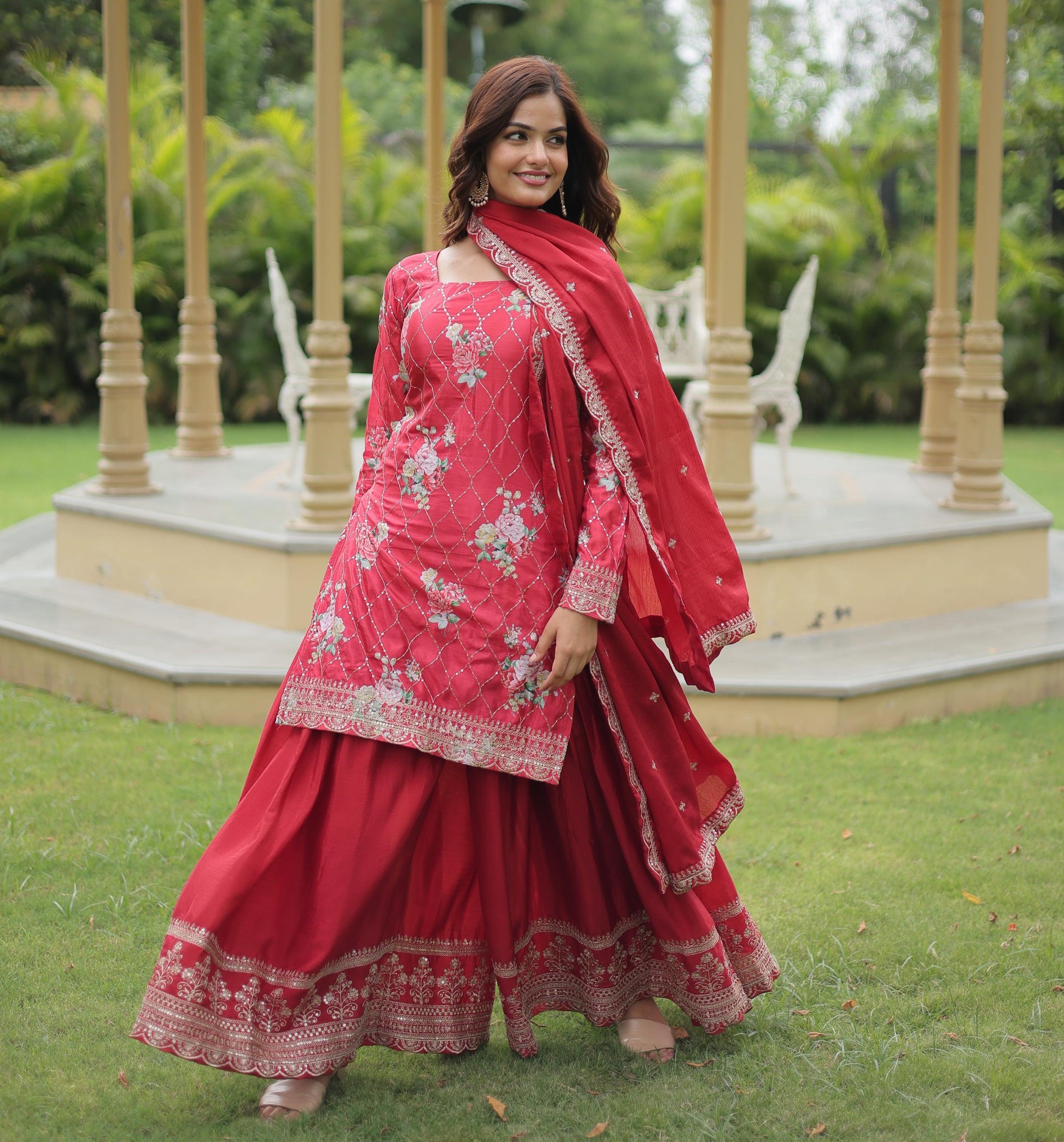 Thread Embroidery With Chinnon Print Kurta Plazzo Set With Dupatta